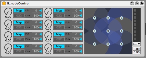 nodecontrol – a max for live device which lets you assign 8 knobs to any 8 parameters in Live and then create 9 presets of settings for those parameters. then you interpolate between the presets using a 2D node space, allowing you to control many parameters with a single intuitive mouse gesture. screenshot